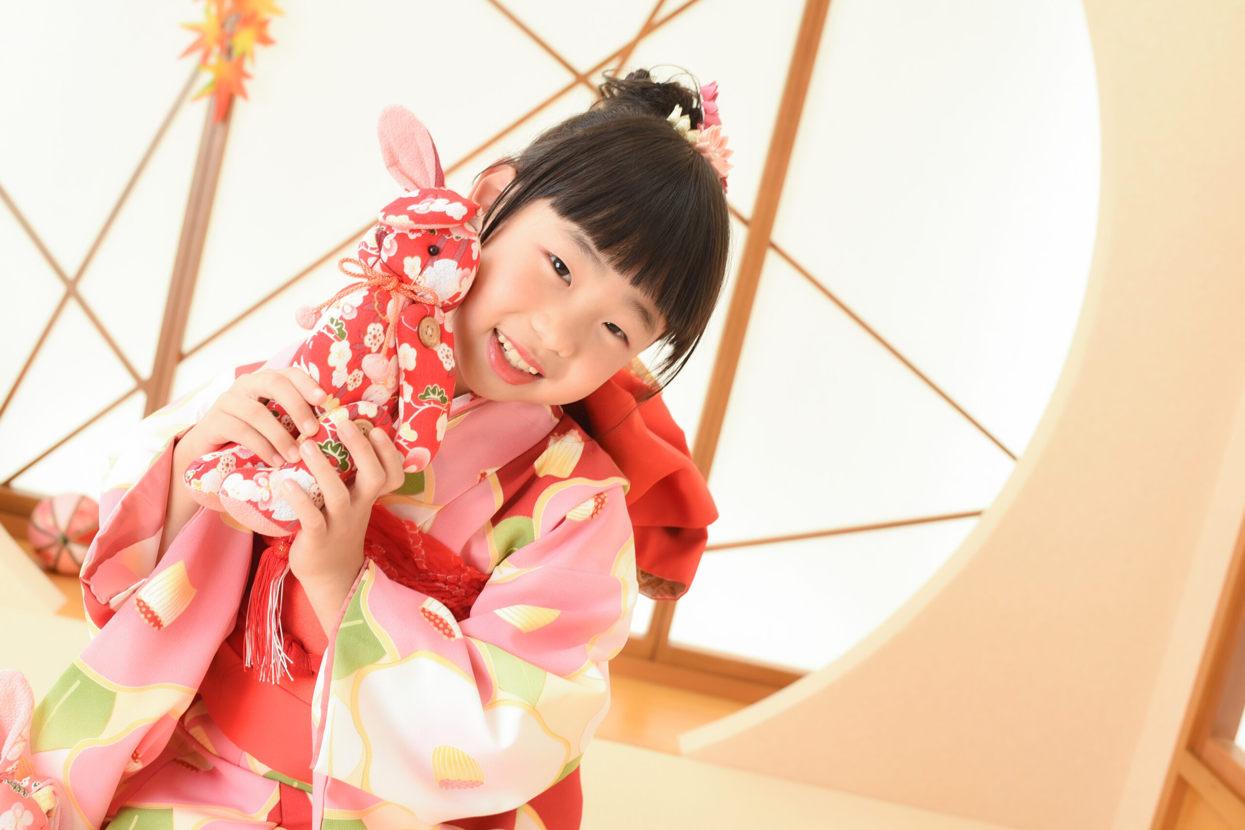 和柄のうさぎのぬいぐるみといっしょに・・・